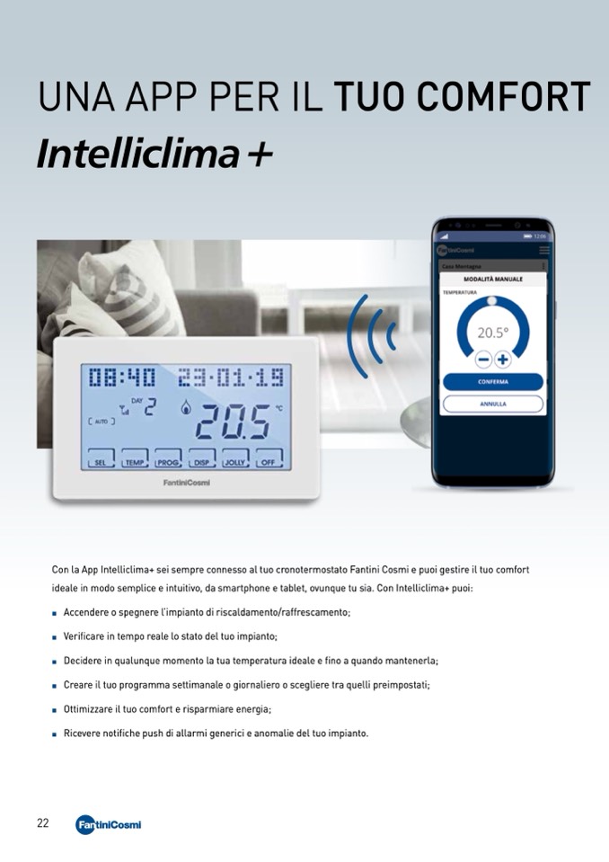 Con la App Intelliclima+ sei sempre connesso al tuo cronotermostato Fantini Cosmi e puoi gestire il tuo comfort