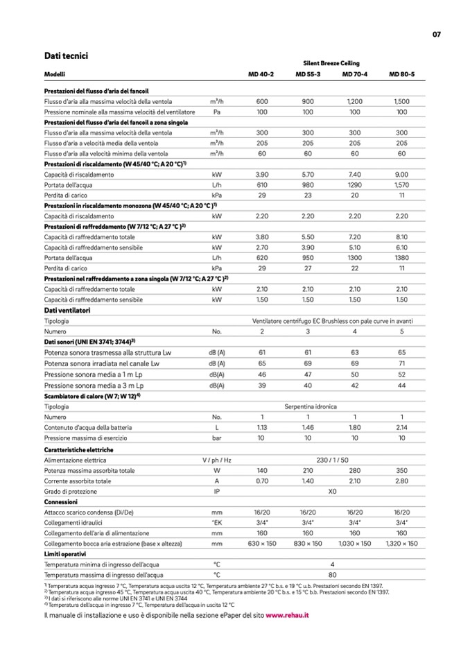Temperatura acqua ingresso 7 °C, Temperatura acqua uscita 12 °C, Temperatura ambiente 27 °C b.s. e 19 °C u.b. Prestazioni secondo EN 1397.