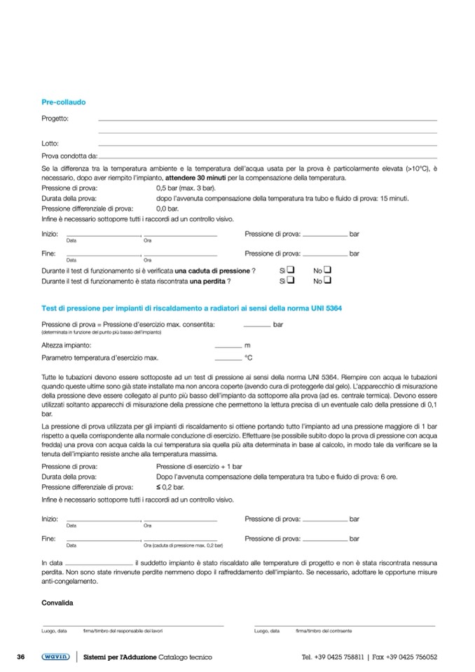 Tutte le tubazioni devono essere sottoposte ad un test di pressione ai sensi della norma UNI 5364. Riempire con acqua le tubazioni