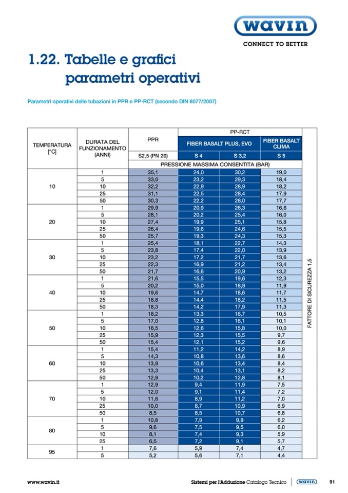 Parametri operativi delle tubazioni in PPR e PP-RCT (secondo DIN 8077/2007)