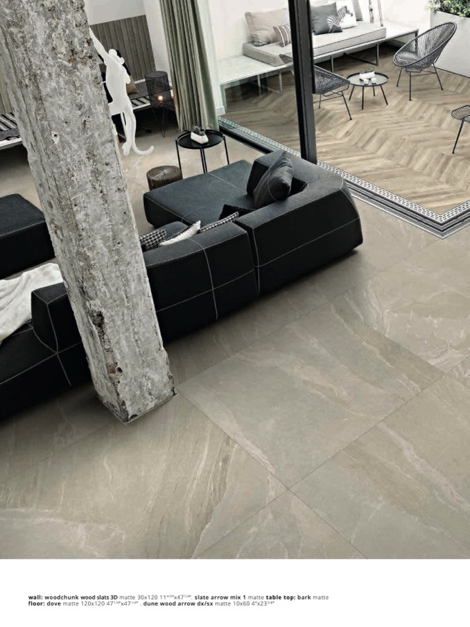 floor: dove matte 120x120 471/4”x471/4” . dune wood arrow dx/sx matte 10x60 4”x235/8”