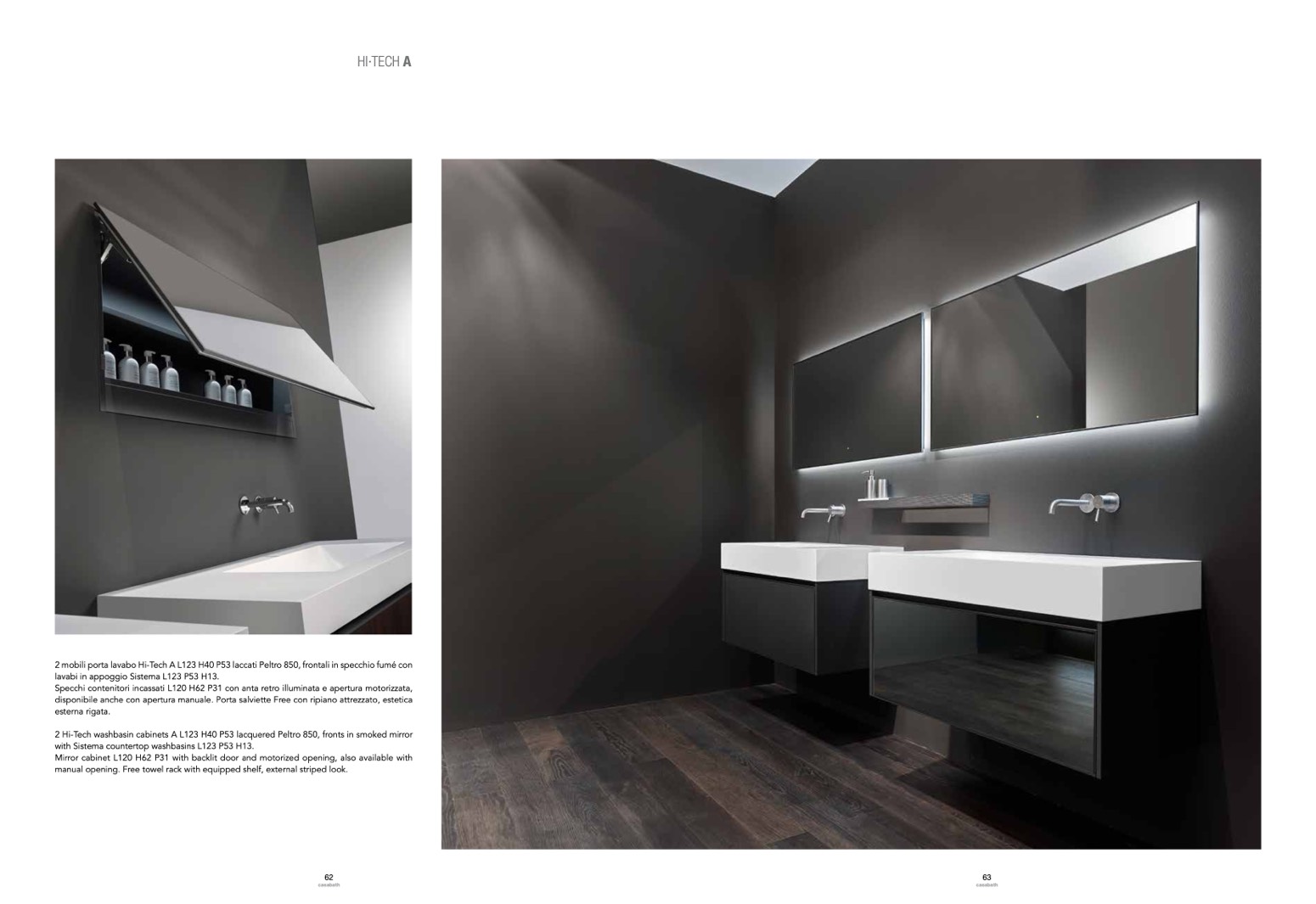 2 Hi-Tech washbasin cabinets A L123 H40 P53 lacquered Peltro 850, fronts in smoked mirror