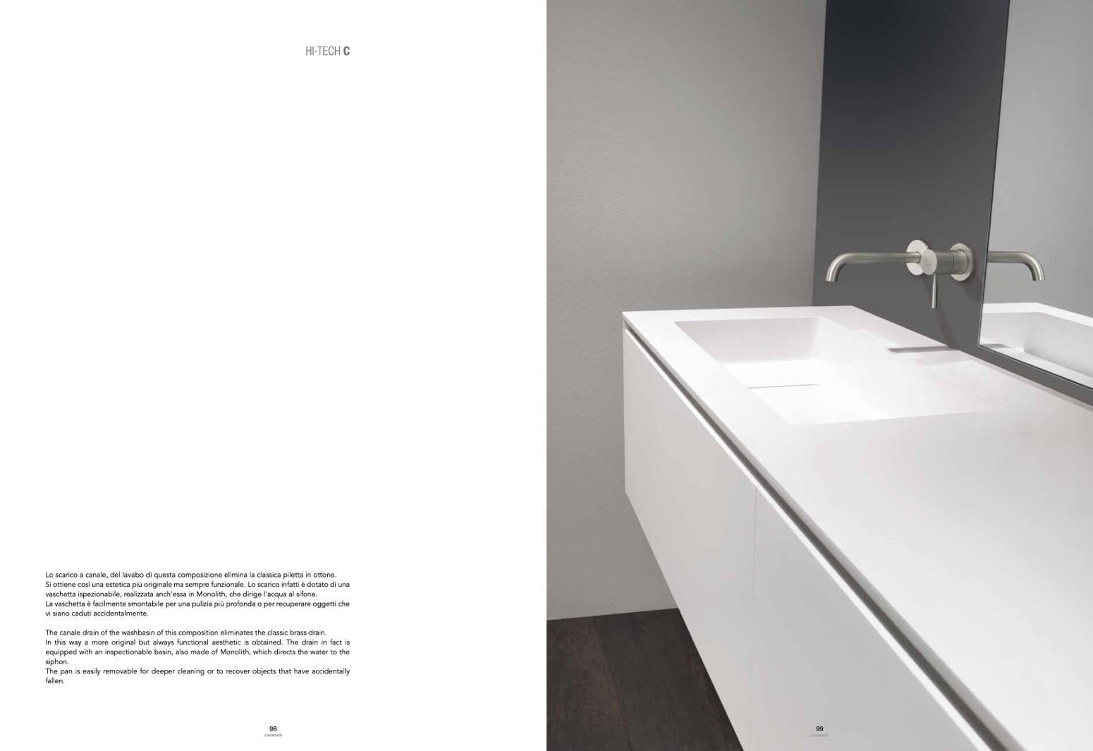The canale drain of the washbasin of this composition eliminates the classic brass drain.