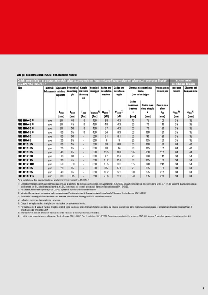 9) I carichi forniti fanno riferimento al Benestare Tecnico Europeo ETA-15/0352, Data di emissione: 30/10/2018. Determinazione dei carichi in accordo a ETAG 001, Annesso C, Metodo A (per carichi statici e quasi-statici).