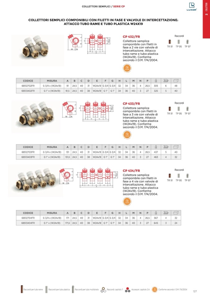 COLLETTORI SEMPLICI COMPONIBILI CON FILETTI IN FASE E VALVOLE DI INTERCETTAZIONE: