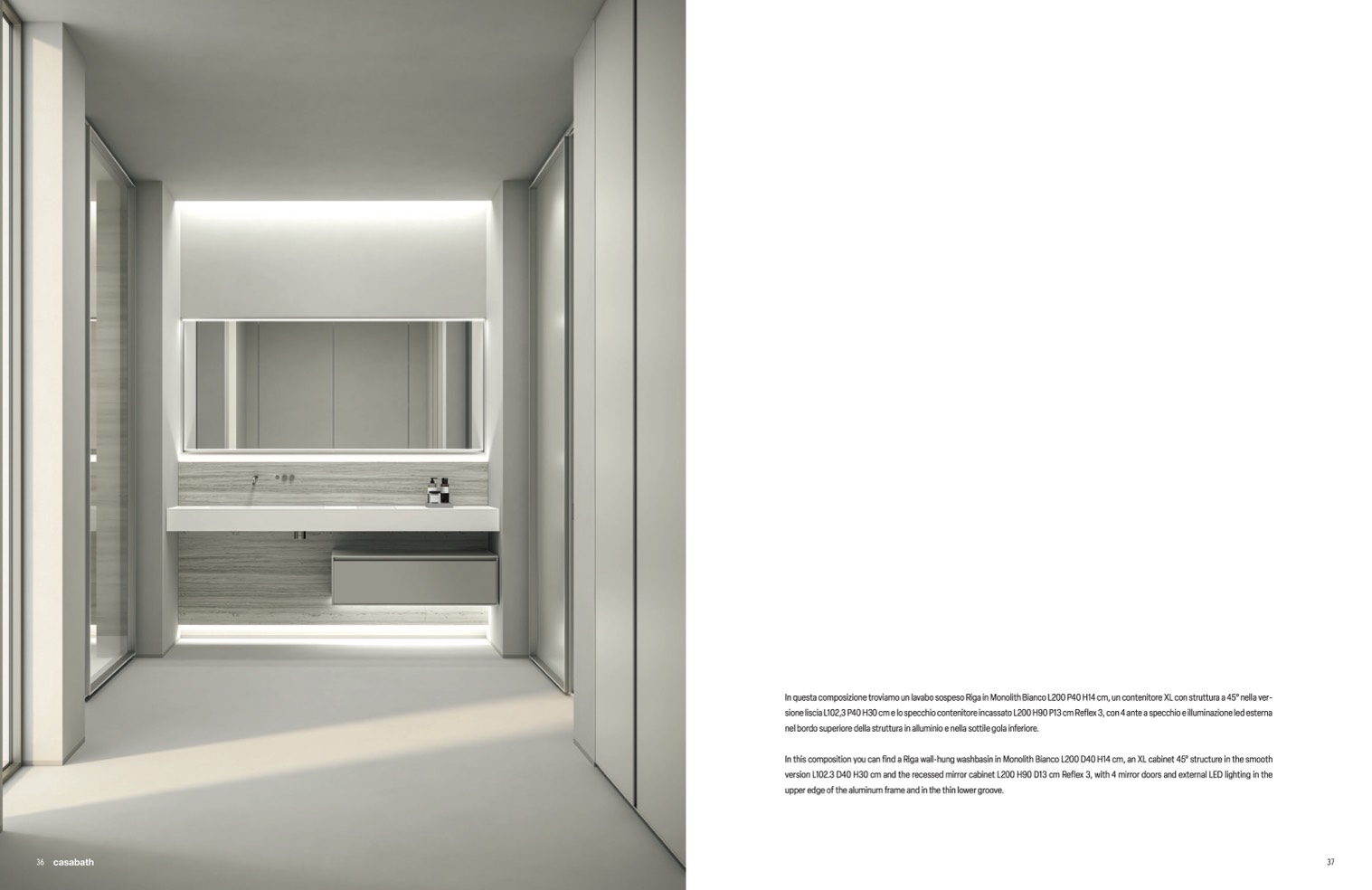 In this composition you can find a Riga wall-hung washbasin in Monolith Bianco L200 D40 H14 cm, an XL cabinet 45° structure in the smooth