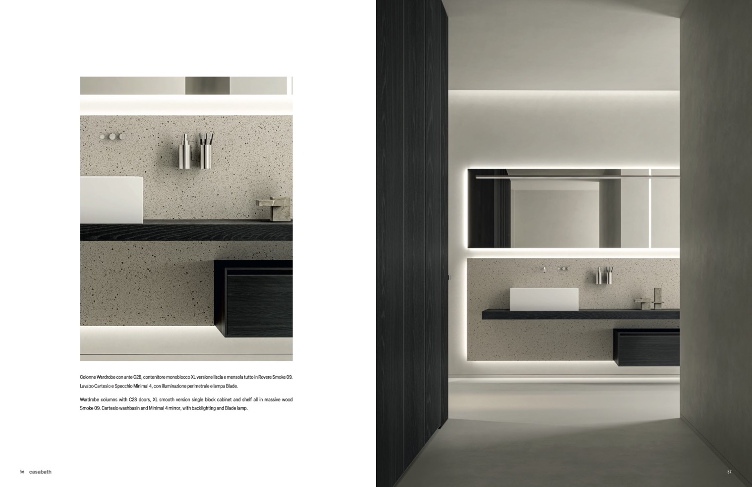 Smoke 09. Cartesio washbasin and Minimal 4 mirror, with backlighting and Blade lamp.