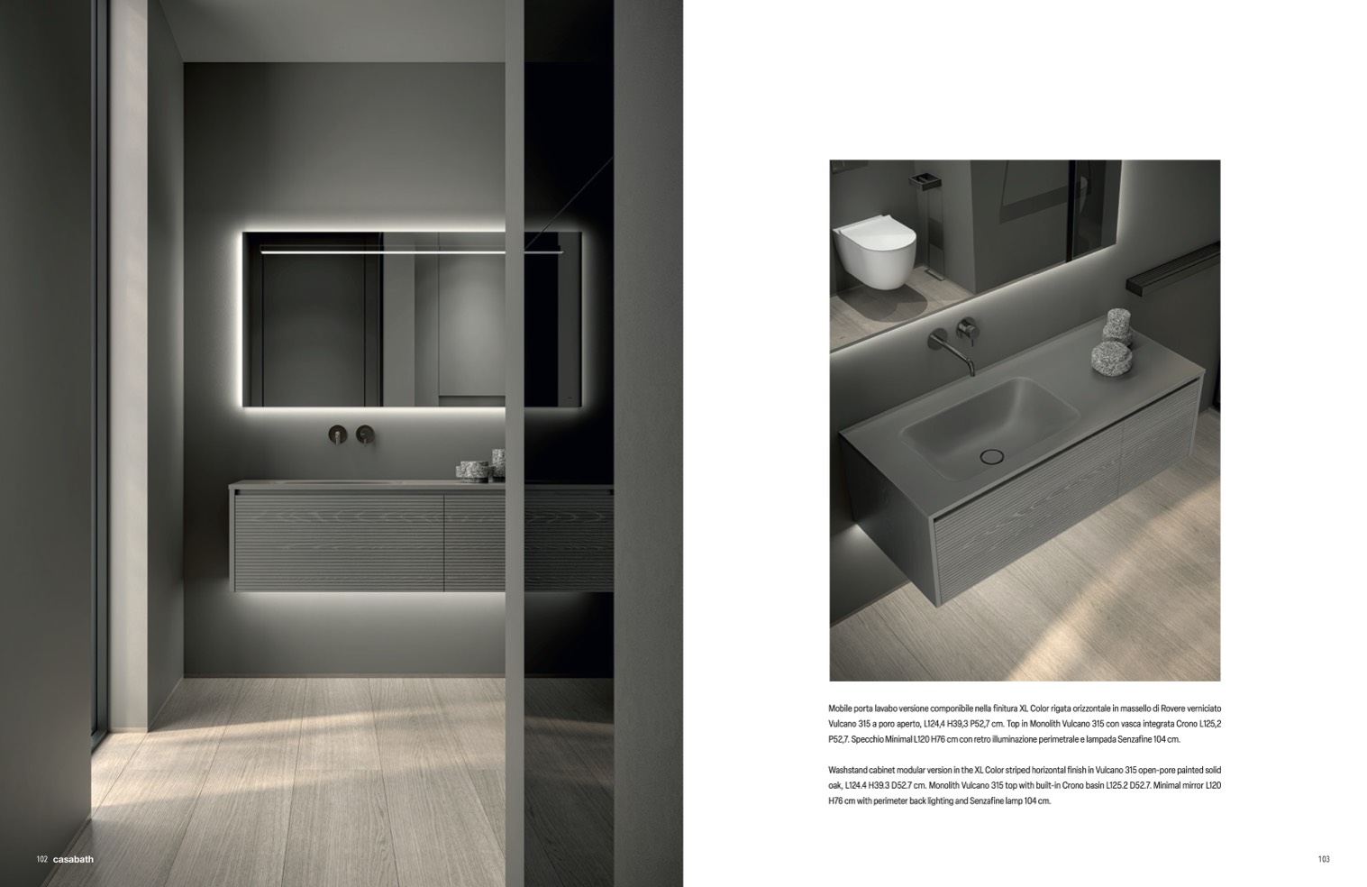 oak, L124.4 H39.3 D52.7 cm. Monolith Vulcano 315 top with built-in Crono basin L125.2 D52.7. Minimal mirror L120
