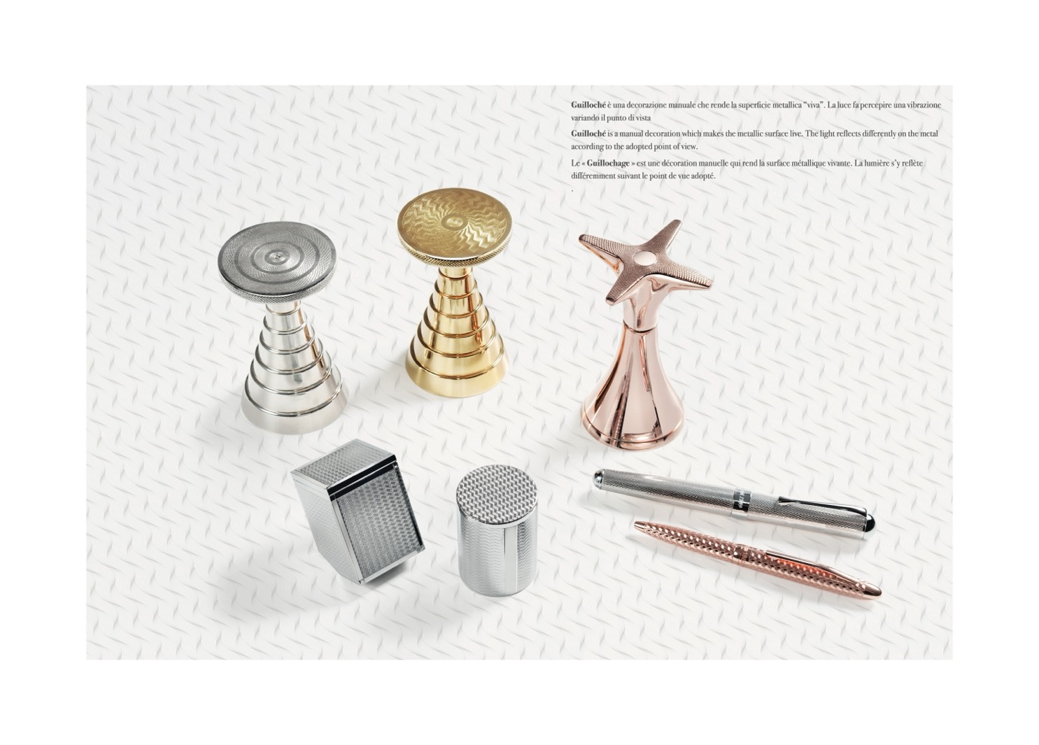 Guilloché è una decorazione manuale che rende la superficie metallica “viva”. La luce fa percepire una vibrazione
