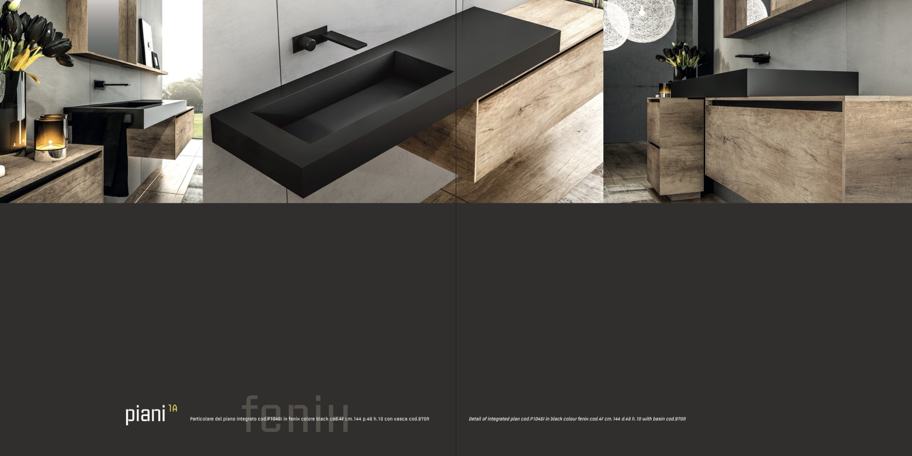Detail of integrated plan cod.P1046I in black colour fenix cod.4F cm.144 d.46 h.10 with basin cod.B70R
