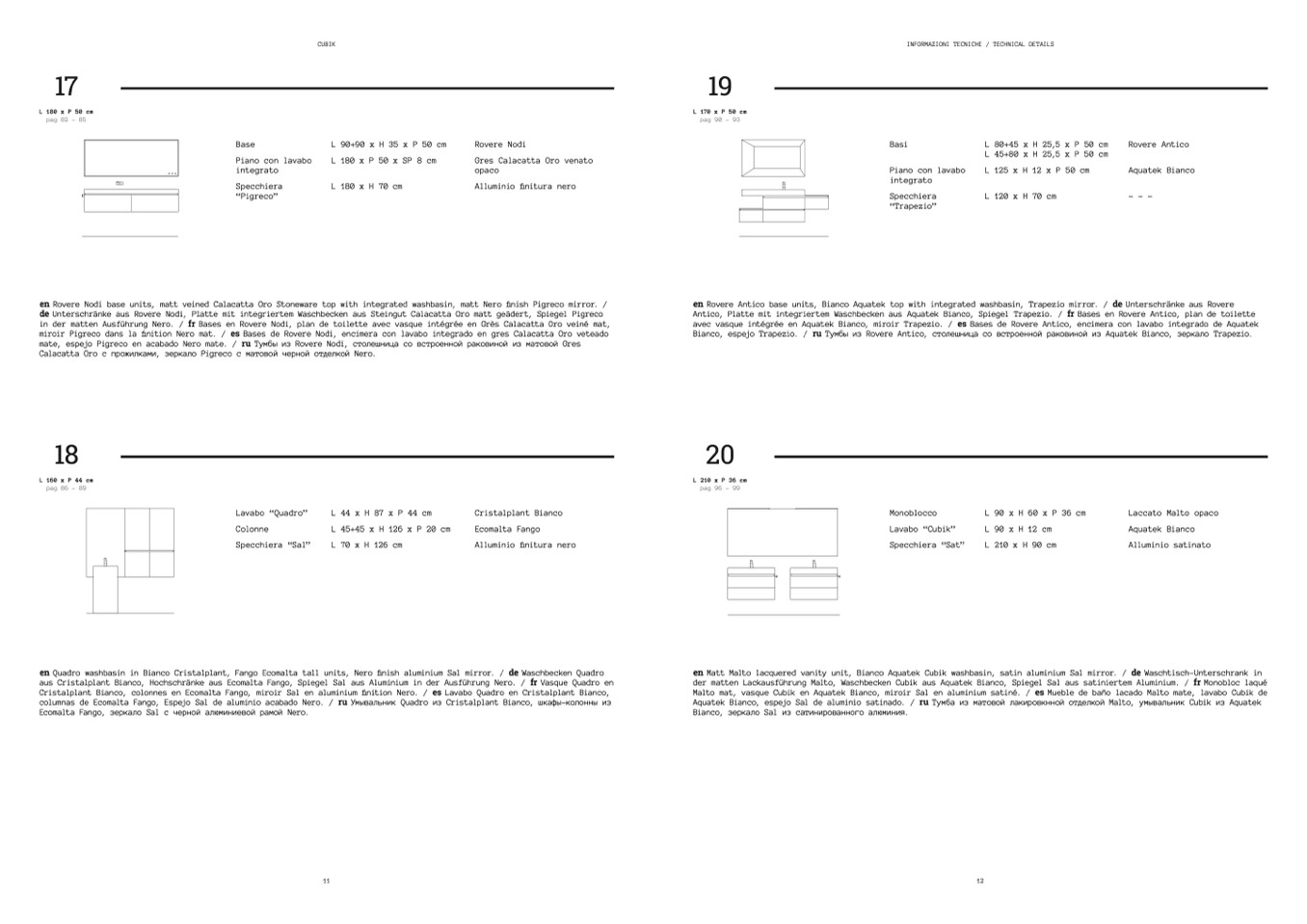 Antico, Platte mit integriertem Waschbecken aus Aquatek Bianco, Spiegel Trapezio. / fr Bases en Rovere Antico, plan de toilette