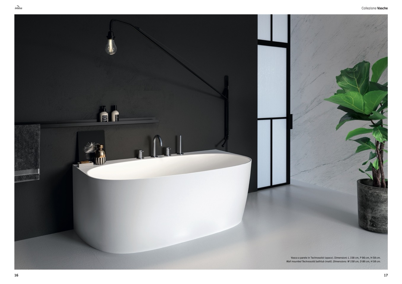 Vasca a parete in Technosolid (opaco). Dimensioni: L 158 cm, P 86 cm, H 58 cm.