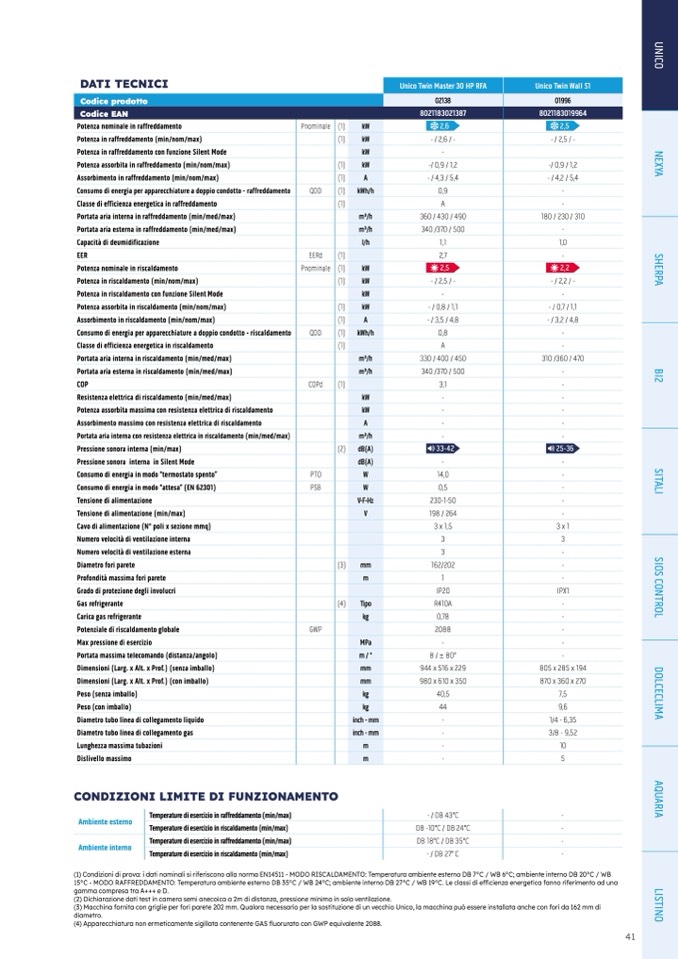 (1) Condizioni di prova: i dati nominali si riferiscono alla norma EN14511 - MODO RISCALDAMENTO: Temperatura ambiente esterno DB 7°C / WB 6°C; ambiente interno DB 20°C / W