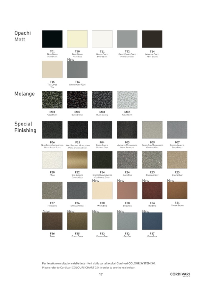 Per l’esatta consultazione delle tinte riferirsi alla cartella colori Cordivari COLOUR SYSTEM 3.0.