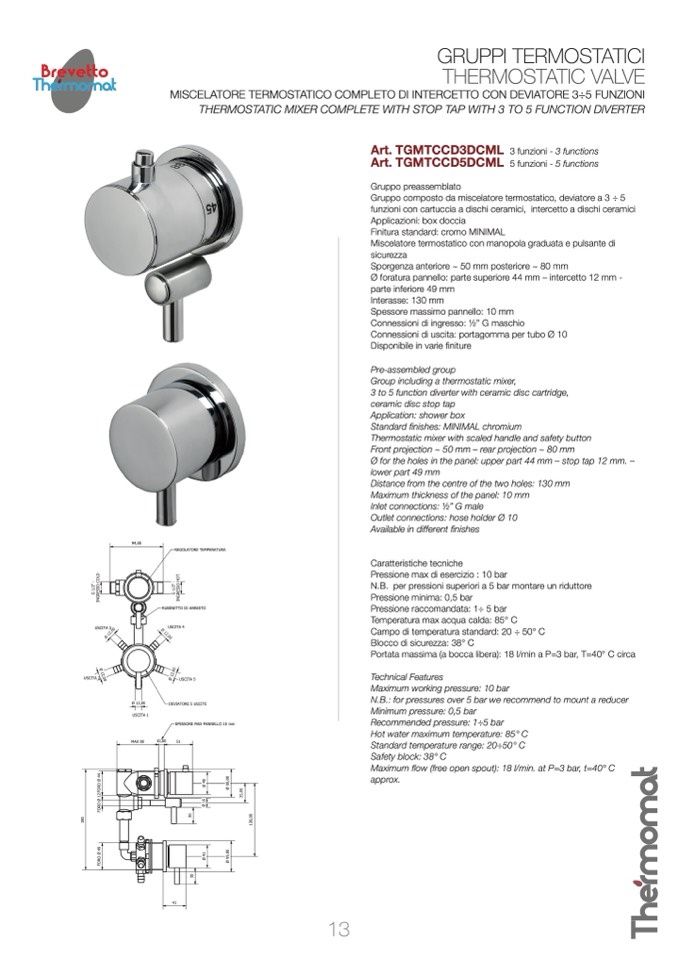 MISCELATORE TERMOSTATICO COMPLETO DI INTERCETTO CON DEVIATORE 3÷5 FUNZIONI