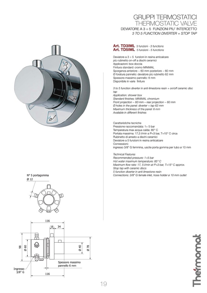 3 to 5 function diverter in anti-limestone resin + on/off ceramic disc