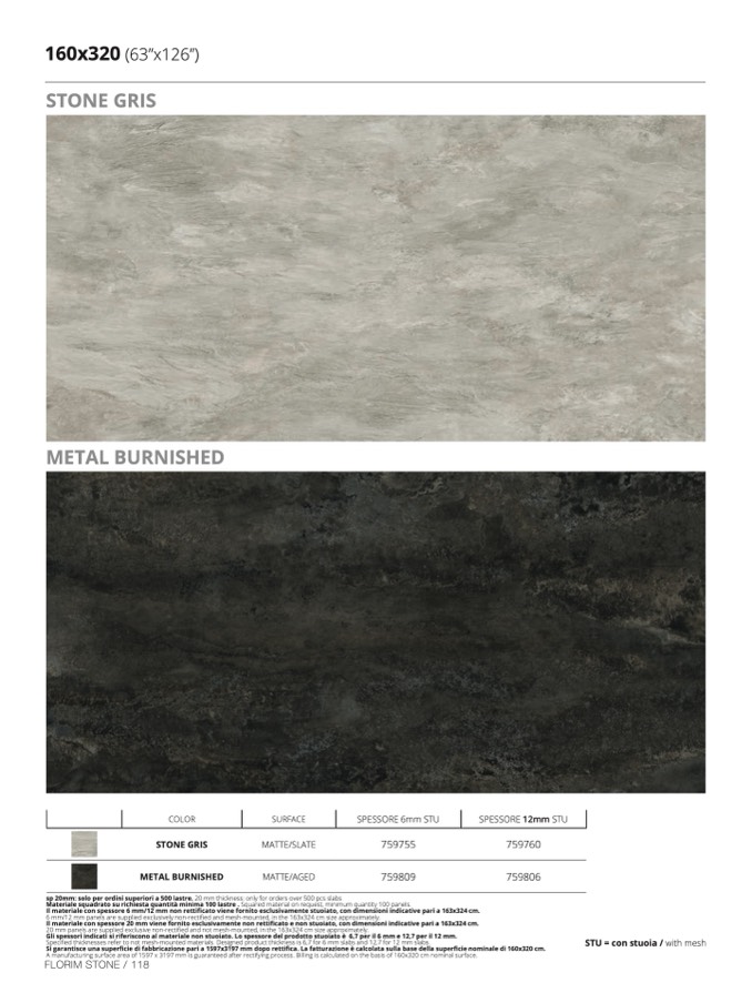 sp 20mm: solo per ordini superiori a 500 lastre. 20 mm thickness: only for orders over 500 pcs slab