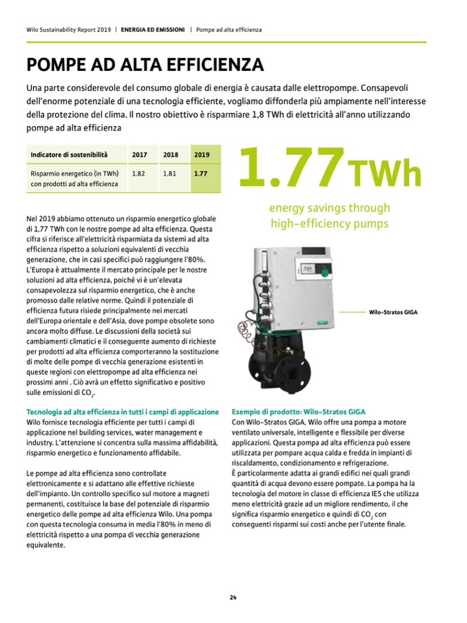 Wilo Sustainability Report 2019 | ENERGIA ED EMISSIONI | Pompe ad alta efficienza