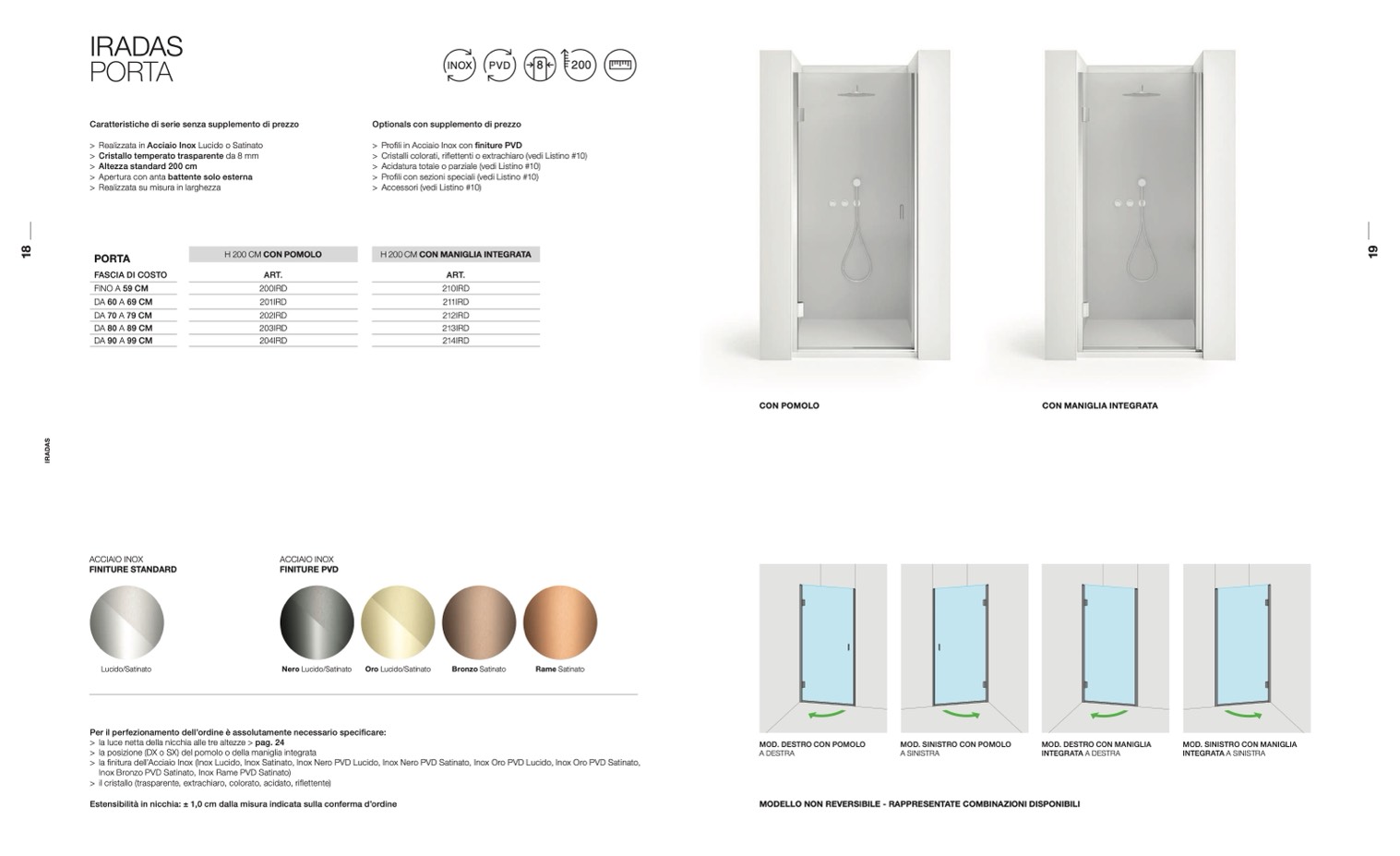 > la finitura dell’Acciaio Inox (Inox Lucido, Inox Satinato, Inox Nero PVD Lucido, Inox Nero PVD Satinato, Inox Oro PVD Lucido, Inox Oro PVD Satinato,
