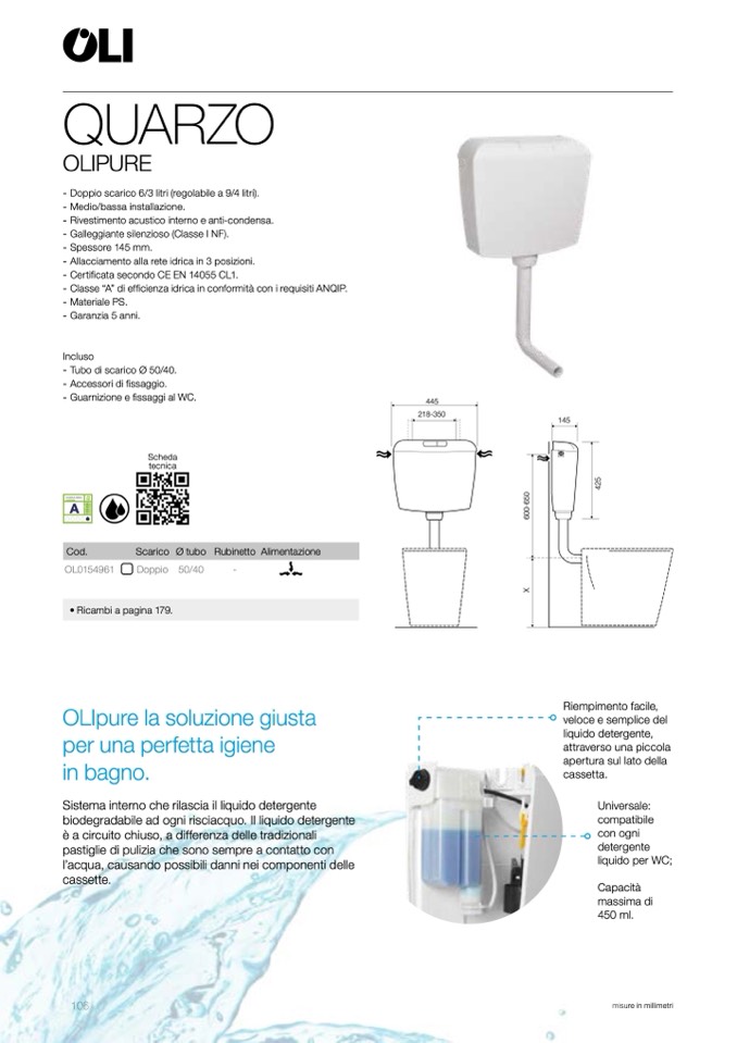 - Doppio scarico 6/3 litri (regolabile a 9/4 litri).
