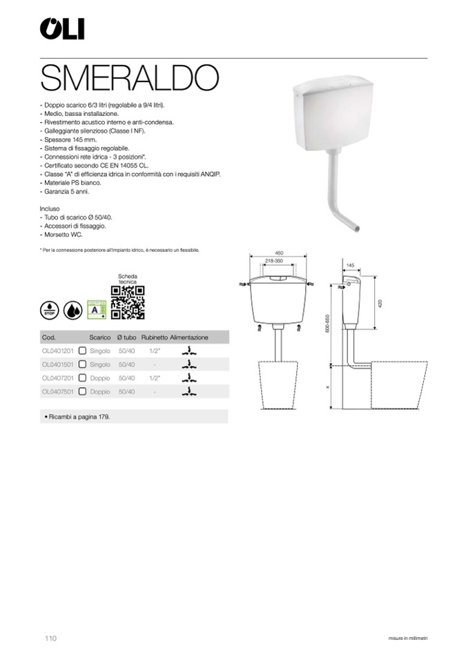 - Doppio scarico 6/3 litri (regolabile a 9/4 litri).