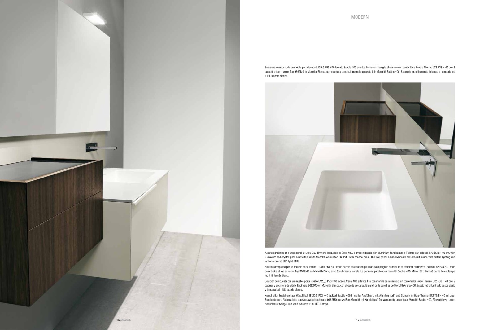 cassetti e top in vetro. Top 9662MO in Monolith Bianco, con scarico a canale. Il pannello a parete è in Monolith Sabbia 400. Specchio retro illuminato in basso e lampada led
