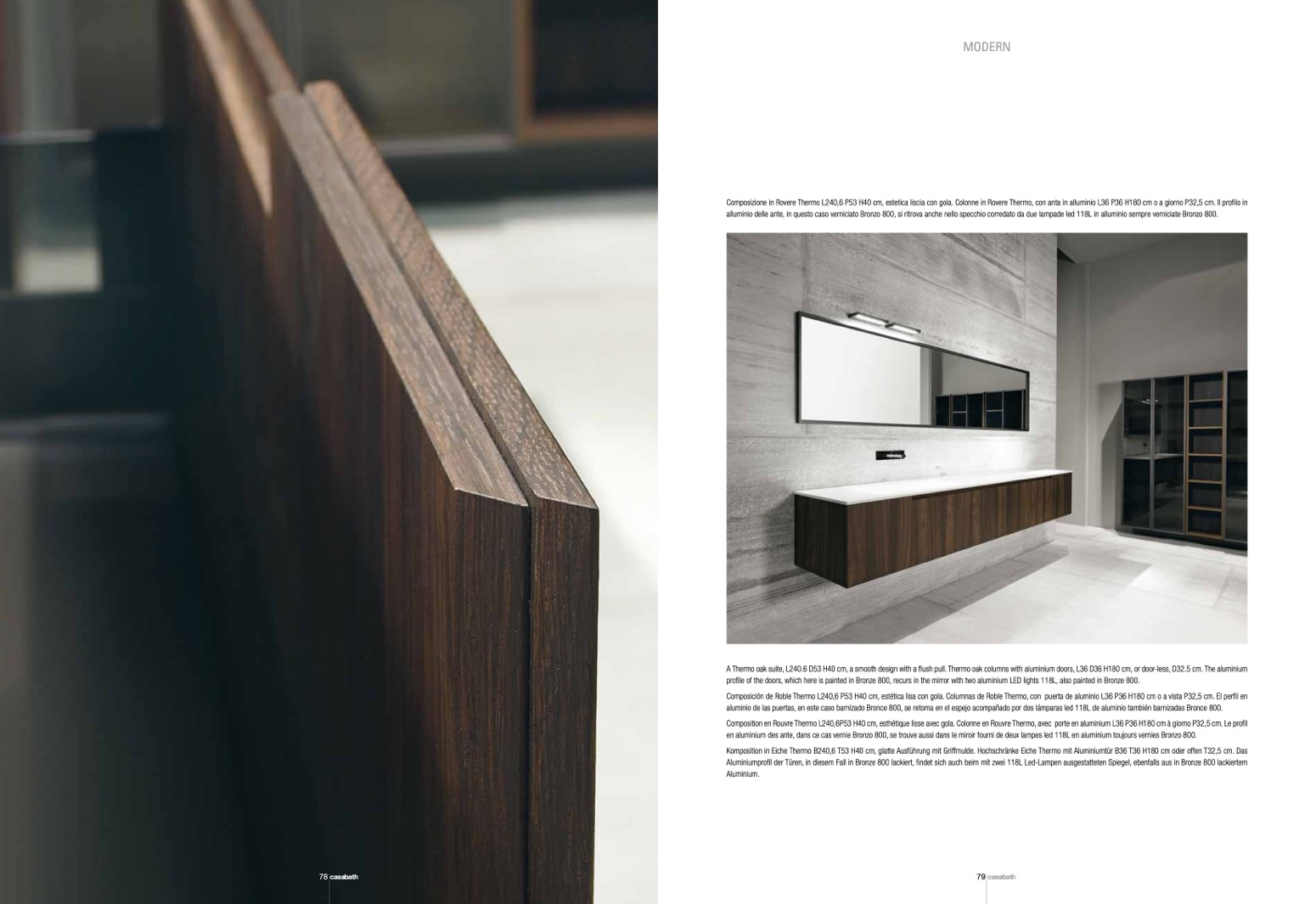 Aluminiumprofil der Türen, in diesem Fall in Bronze 800 lackiert, findet sich auch beim mit zwei 118L Led-Lampen ausgestatteten Spiegel, ebenfalls aus in Bronze 800 lackiertem