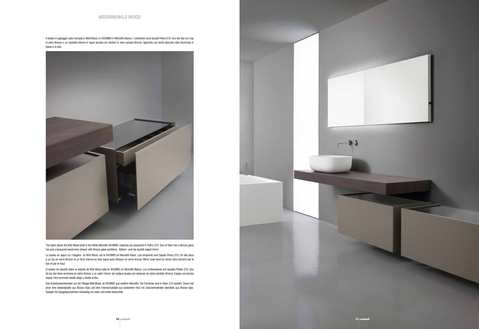 The basin above the Wild Wood shelf is the White Monolith 9439MO. Cabinets are lacquered in Pietra 310. One of them has a Bronze glass