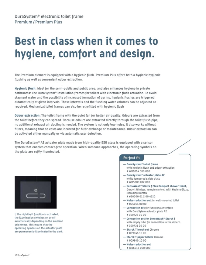 The Premium element is equipped with a hygienic flush. Premium Plus offers both a hygienic hygienic