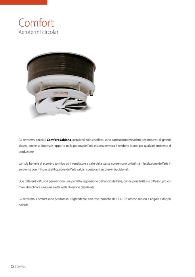 Gli aerotermi Comfort sono prodotti in 10 grandezze, con rese termiche da 17 a 107 kW con motori a singola e doppia