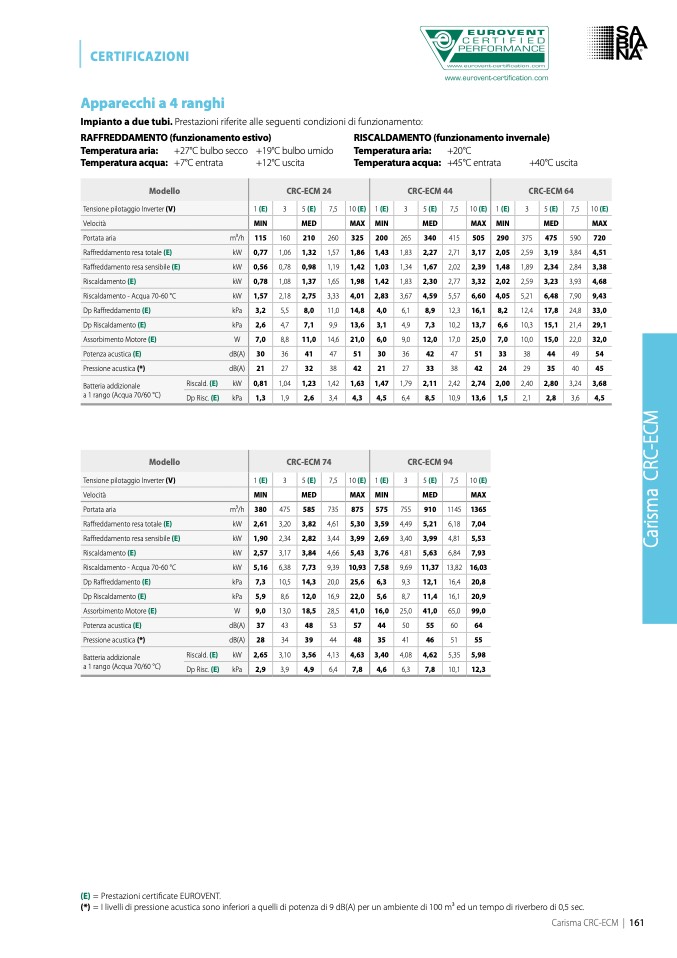 Impianto a due tubi. Prestazioni riferite alle seguenti condizioni di funzionamento: