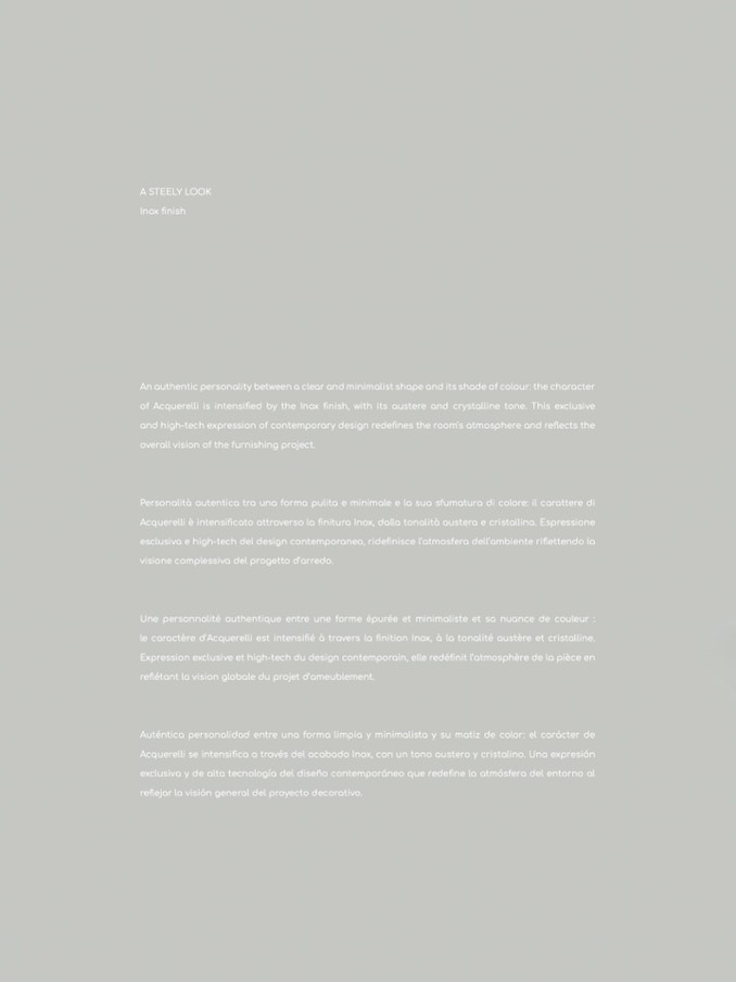 le caractère d’Acquerelli est intensifié à travers la finition Inox, à la tonalité austère et cristalline.