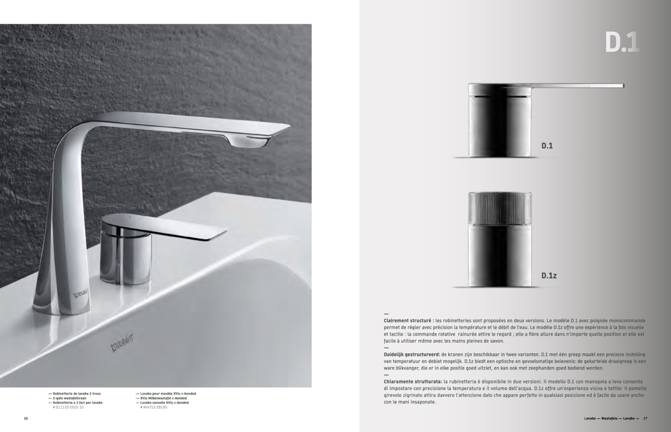 Clairement structuré : les robinetteries sont proposées en deux versions. Le modèle D.1 avec poignée monocommande