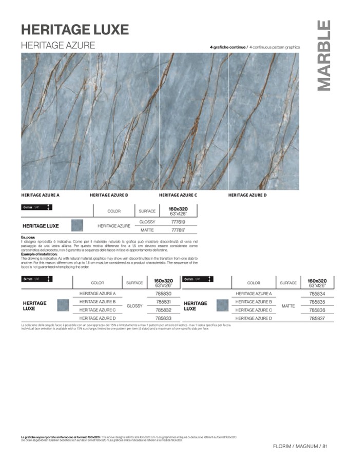 La selezione delle singole facce è possibile con un sovrapprezzo del 15% e limitatamente a max 1 pattern per articolo (4 lastre) - max 1 lastra speci