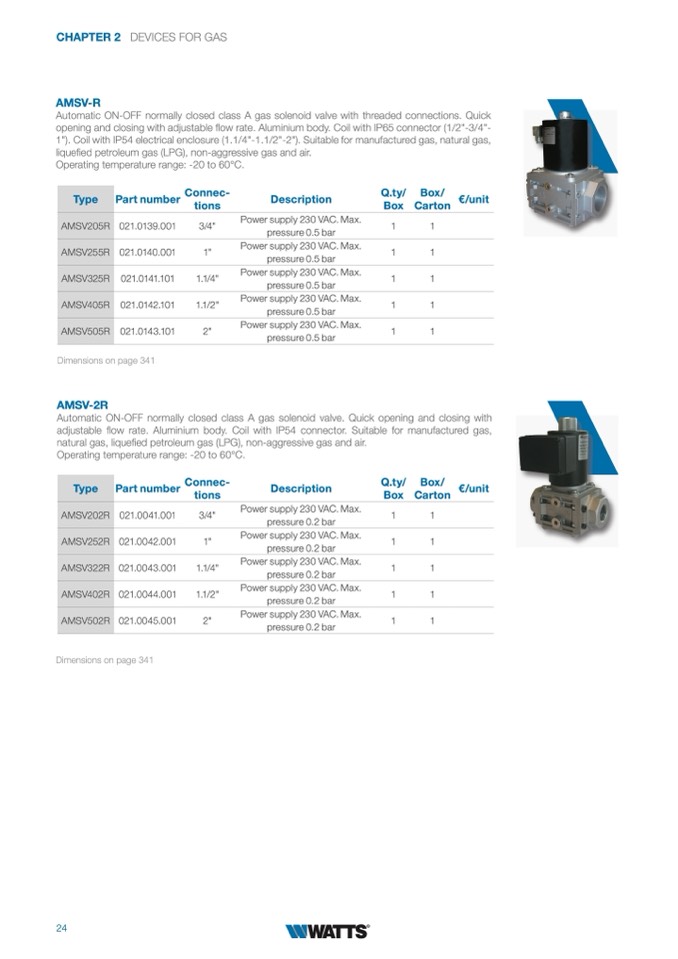 1"). Coil with IP54 electrical enclosure (1.1/4"-1.1/2"-2"). Suitable for manufactured gas, natural gas,