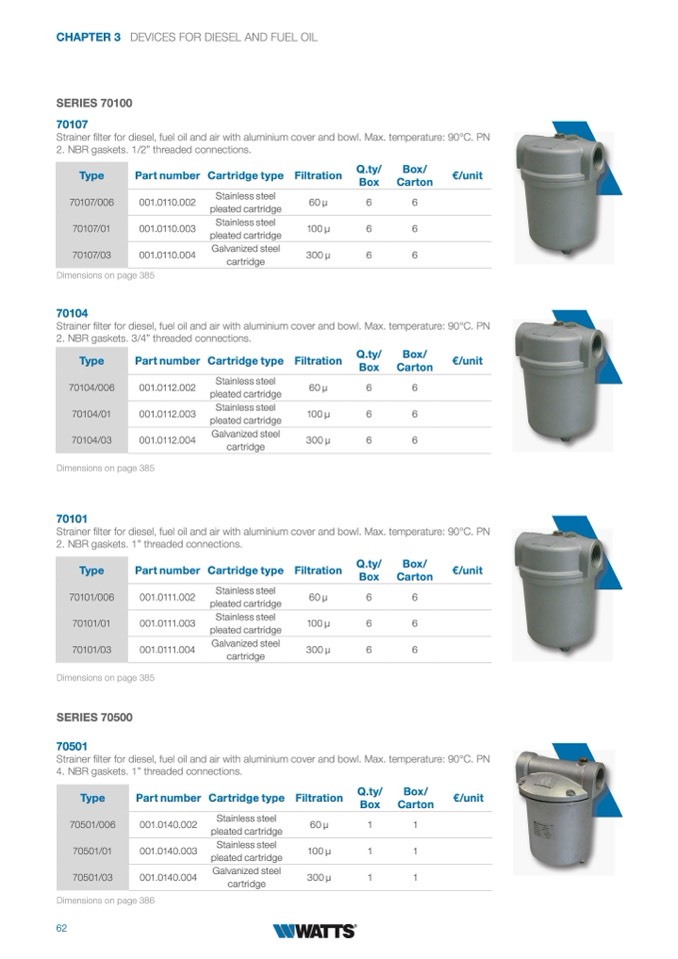 Strainer filter for diesel, fuel oil and air with aluminium cover and bowl. Max. temperature: 90°C. PN