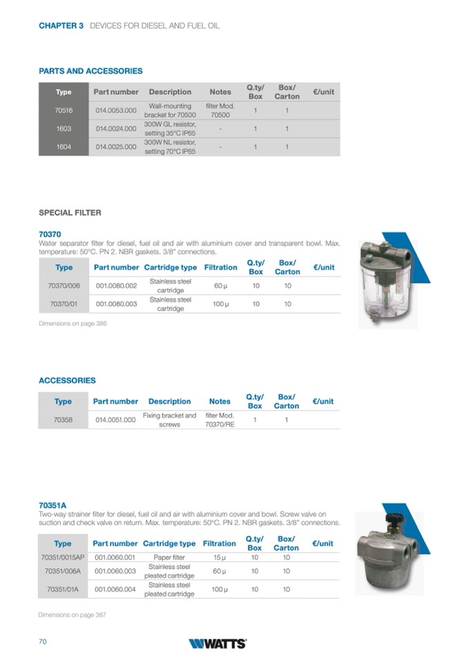 suction and check valve on return. Max. temperature: 50°C. PN 2. NBR gaskets. 3/8” connections.