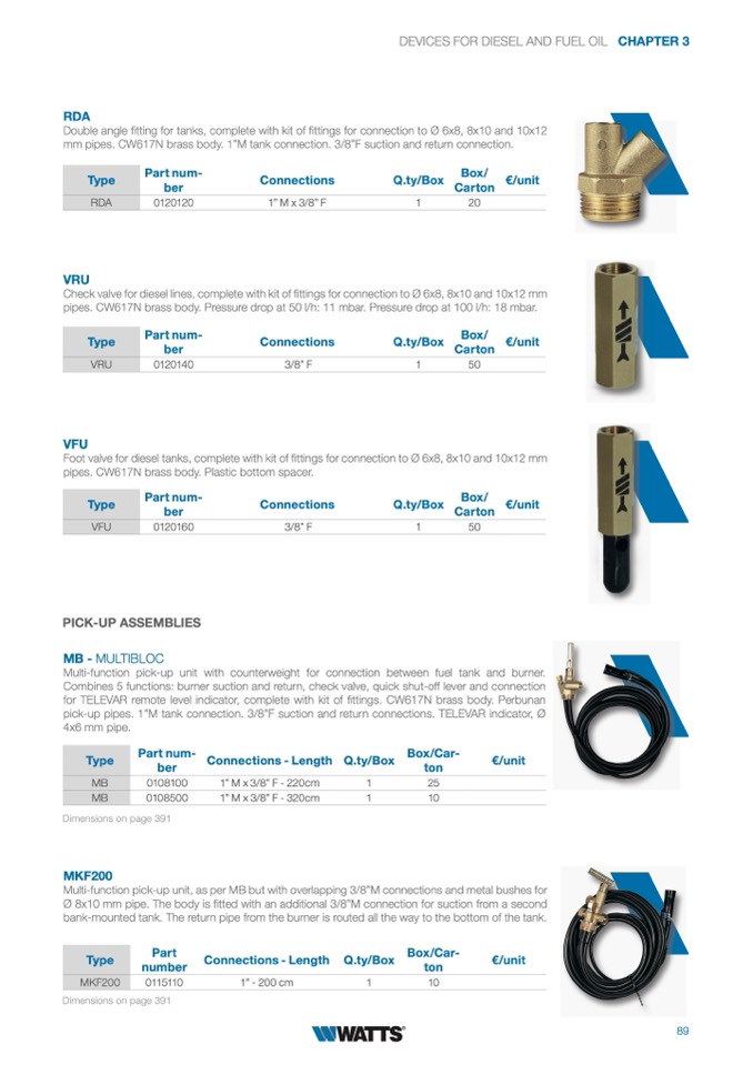 pick-up pipes. 1”M tank connection. 3/8”F suction and return connections. TELEVAR indicator, Ø