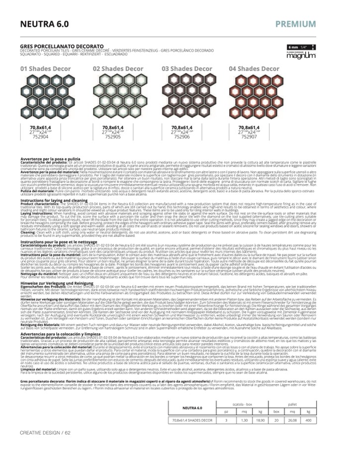 atteristiche del prodotto: Gli articoli SHADES 01-02-03-04 di Neutra 6.0 sono prodotti mediante un nuovo sistema produttivo che non prevede la cottura ad alte temperature come le piastrell