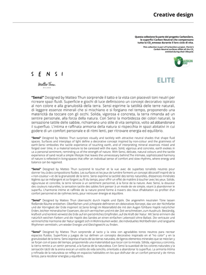 und der Körnigkeit der Erde inspiriert ist.Sensi bringt im Materialbild die mit den Augen fühlbare Haptik natürlicher