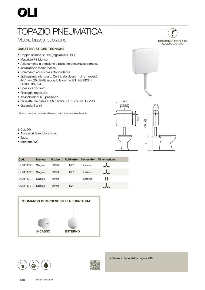 • Doppio scarico 6/3 litri (regolabile a 9/4 l)
