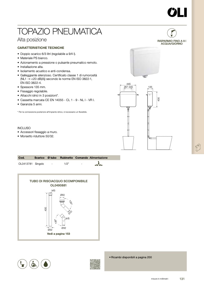 • Doppio scarico 6/3 litri (regolabile a 9/4 l)