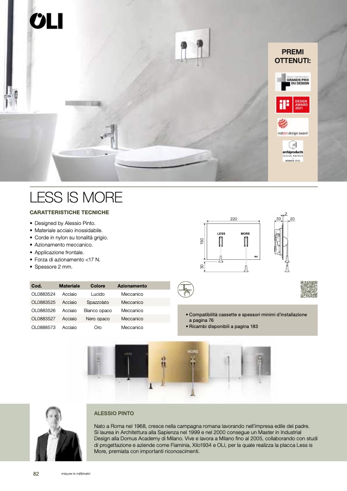 di progettazione e aziende come Flaminia, Xilo1934 e OLI, per la quale realizza la placca Less is