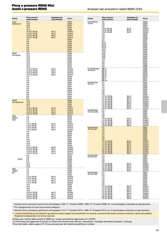 I sistemi pressfitting per gli impianti a gas devono essere eseguiti esclusivamente con le pinze a pressare Mini/anelli a pressare indicate in giallo nella tabella.