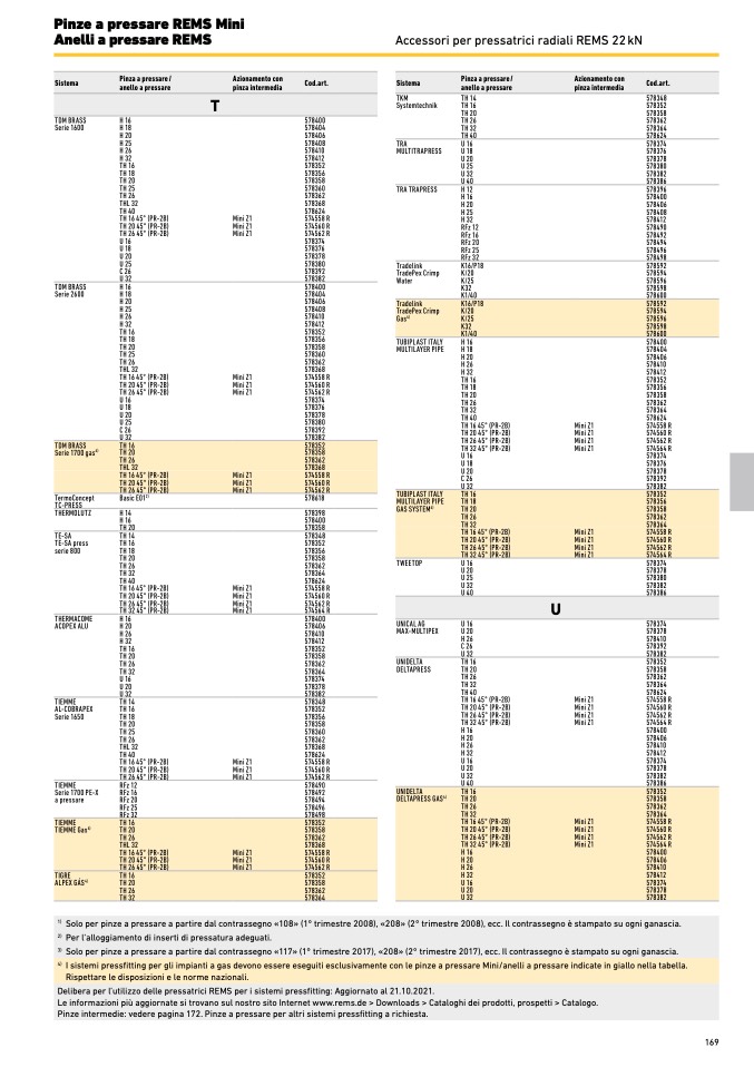 I sistemi pressfitting per gli impianti a gas devono essere eseguiti esclusivamente con le pinze a pressare Mini/anelli a pressare indicate in giallo nella tabella.