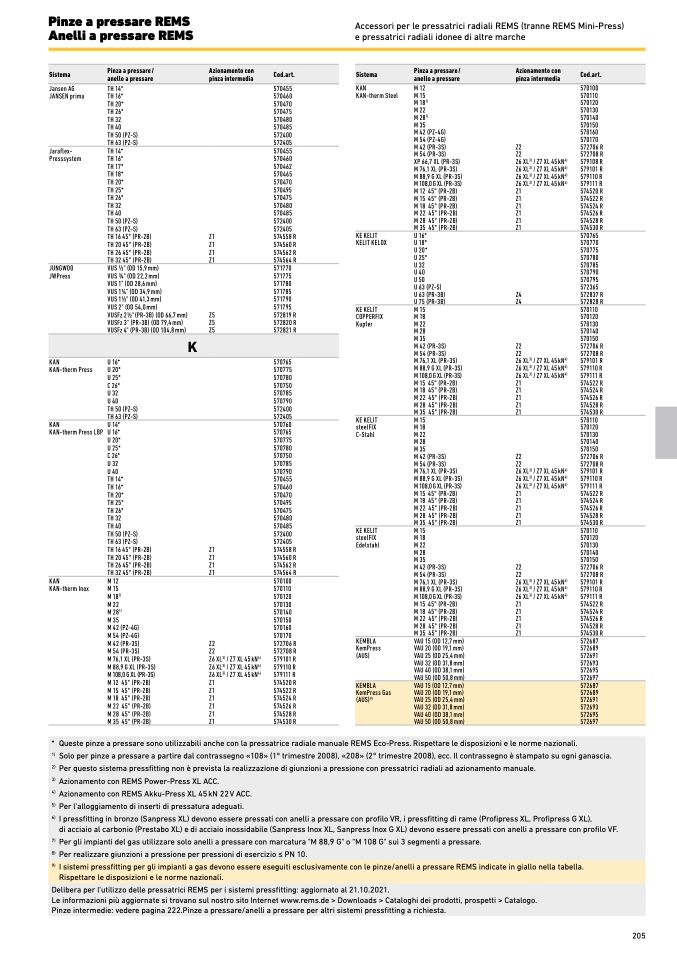 I sistemi pressfitting per gli impianti a gas devono essere eseguiti esclusivamente con le pinze/anelli a pressare REMS indicate in giallo nella tabella.