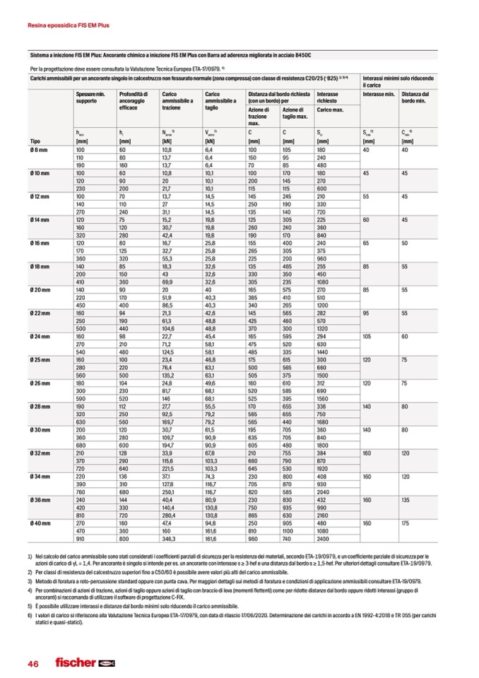 azioni di carico di γL = 1,4. Per ancorante è singolo si intende per es. un ancorante con interasse s ≥ 3·hef e una distanza dal bordo s ≥ 1,5·hef. Per ulteriori dettagli consultare ETA-19/0979.