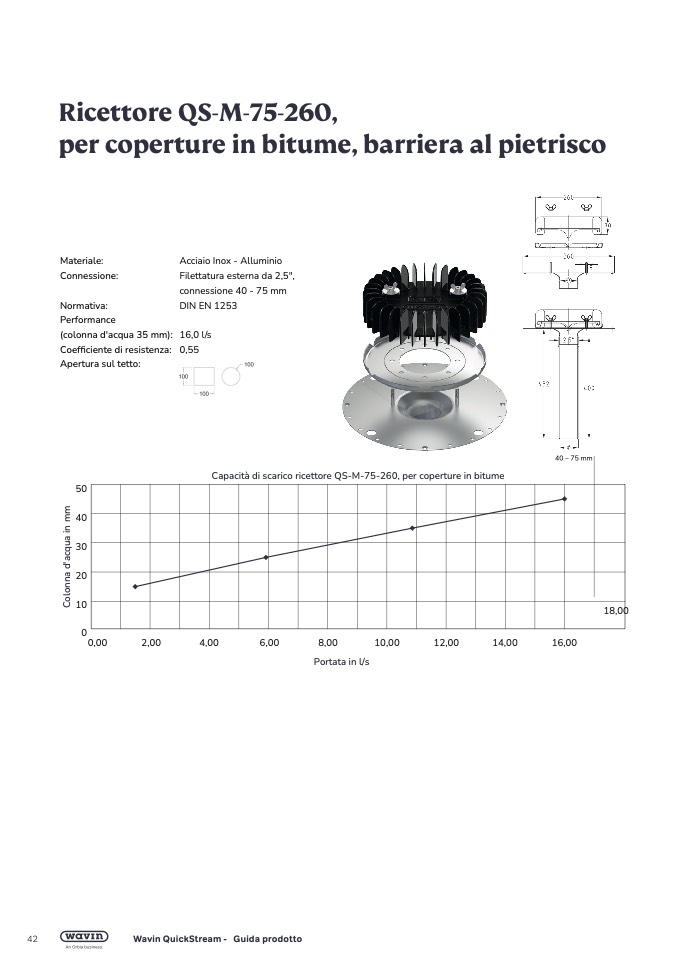 Capacità di scarico ricettore QS-M-75-260, per coperture in bitume