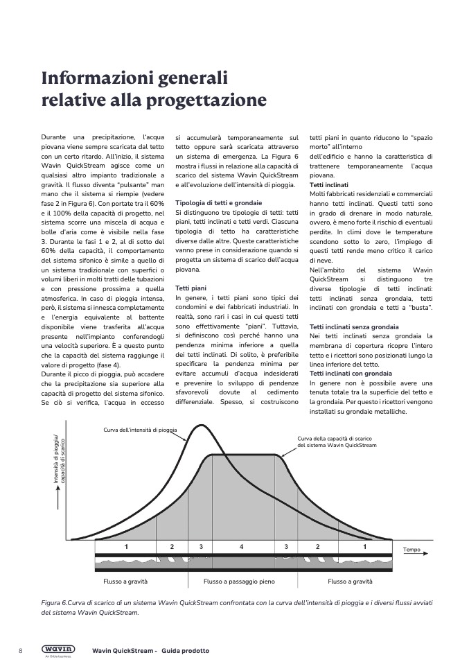 Curva di scarico di un sistema Wavin QuickStream confrontata con la curva dell’intensità di pioggia e i diversi flussi avviati