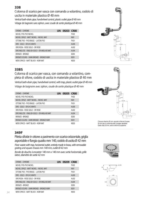 Vertical bath-drain pipe, handwheel control, with trap, plastic outlet pipe Ø 40 mm
